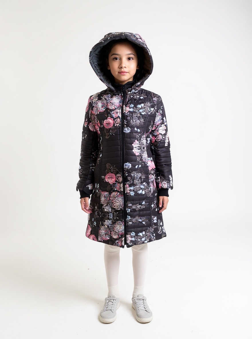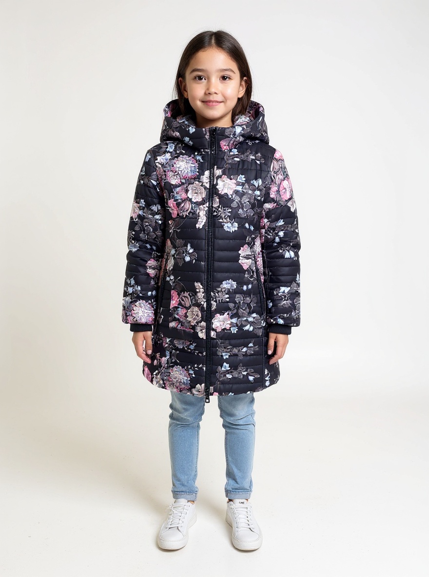 Jakna ima atraktivan cvetni dezen na crnoj osnovi, sa toplom postavom i skidajućom kapuljačom. Zato je savršen izbor za svaku priliku – od škole do porodičnih šetnji.