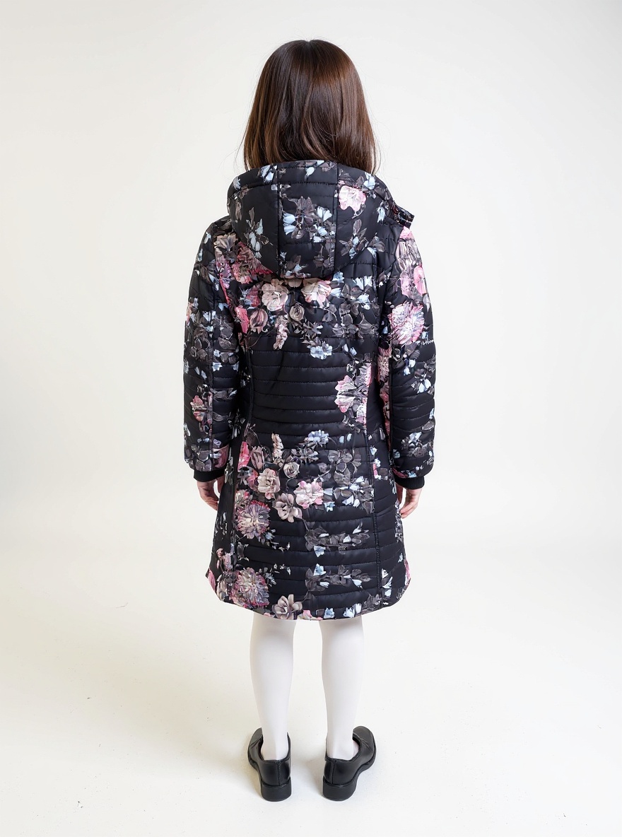 Crna proštepana jakna za devojčice sa cvetnim printom, toplom postavom i skidajućom kapuljačom. Idealna za zimu.